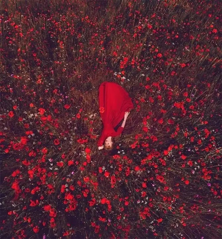 它的美不只是因为像血一样的红色,最关键的是那花心中的一抹黑色。一大片罂粟花田,远远看去洋溢着死亡的气息,那种视觉是美丽和诡异结合在一起的震撼。鲜红如血,又好似已经凝固的血。