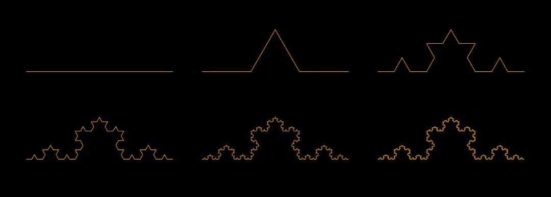 1904年,瑞典数学家柯赫构造了“Koch曲线”几何图形。Koch曲线大于一维,具有无限的长度,但是又小于二维。它和三分康托集一样,是一个典型的分形。根据分形的次数不同,生成的Koch 曲线也有很多种,比如三次 Koch 曲线,四次 Koch 曲线等。下面以三次 Koch 曲线为例,介绍 Koch 曲线的构造方法,其它的可依此类推。三次Koch曲线的构造过程主要分为三大步骤:第一步,给定一个初始图形——一条线段;第二步,将这条线段中间的 1/3 处向外折起;第三步,按照第二步的方法不断的把各段线段中间的 1/3 处向外折起。这样无限的进行下去,最终即可构造出Koch曲线。